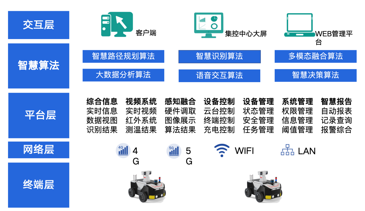 采用“终端层—网络层—平台层—智慧算法层—交互层”五层架构模式。该架构将设备监测、数据传输、智能分析与应用展示高度融合,确保系统具备全覆盖监控、智能识别、实时预警、集中管理、辅助决策的能力。