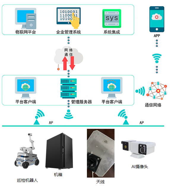 智能巡检机器人系统为网络分布式架构,整体分为三层,分别为后台层、通讯层和终端层。终端层轮式机器人、AI云台相机、机箱和天线构成,通讯层由网络交换机、通讯线缆等设备组成,负责建立基站层与智能终端层的网络通道;后台包括服务器、后台软件、显示屏等设备。