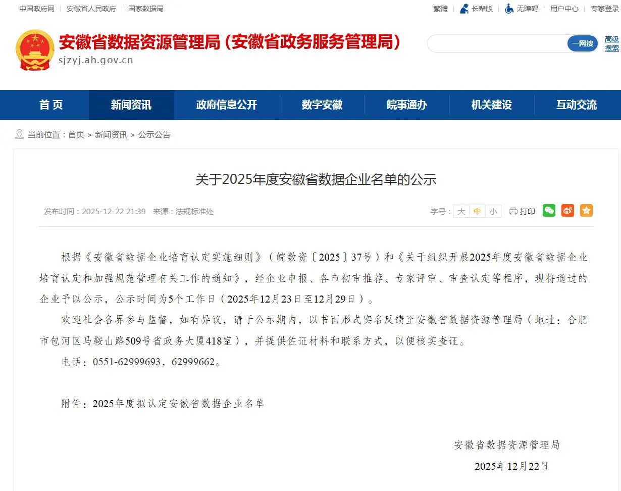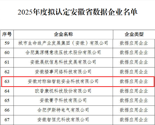 近日,安徽省数据资源管理局正式公示了2025年度“安徽省数据企业”拟认定名单。安徽对称轴智能安全科技有限公司(以下简称“对称轴”)凭借在“特种机器人”与“AI大数据”两大前沿领域的技术深度融合与持续创新,成功入选,标志着公司的技术实力与专业贡献获得了省级权威部门的高度认可。
