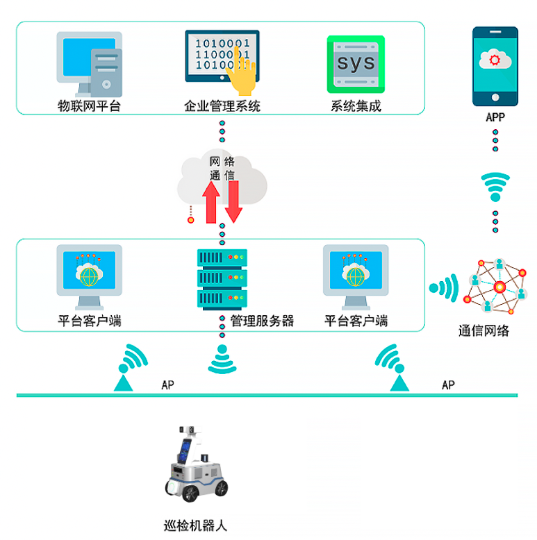 智能巡检机器人系统为网络分布式架构,整体分为三层,分别为后台层、通讯层和终端层。终端层轮式机器人和AI云台相机构成,通讯层由网络交换机、通讯线缆等设备组成,负责建立基站层与智能终端层的网络通道;后台包括服务器、后台软件、显示屏等设备。