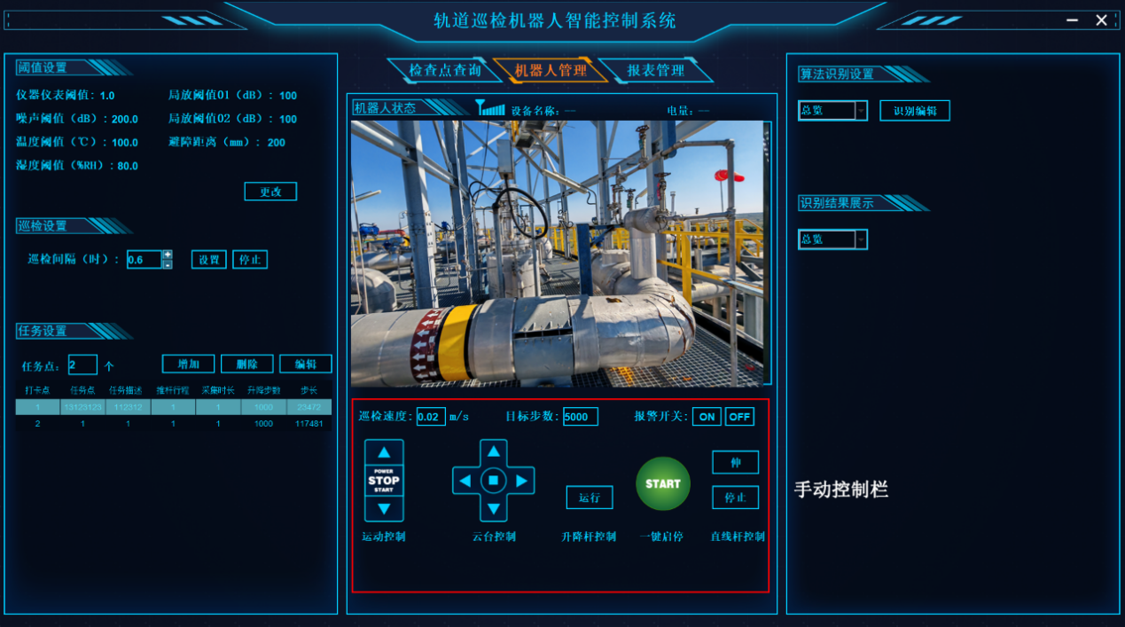 运维人员对机器人的遥控操作具有最大的操作优先级。系统进入遥控巡检模式后,机器人将中止正在执行的其他任务,按人工遥控指令实现机器人在可调速度下的前进、后退,云台的全方位旋转以及双视摄像机的镜头变倍调节,可保证系统在第一时间到达指定位置,获取设备与环境的状态数据与可视图像,提供后台进行决策指挥。